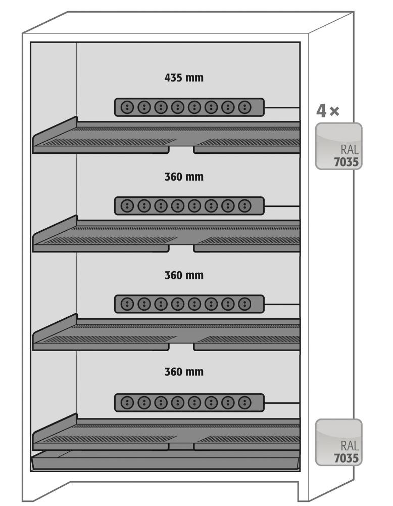 farba korpusu antracitovo sivá (RAL 7016), s výklopnými dverami v enciánovej modrej (RAL 5010), vnútorné vybavenie so 4 x zásuvnými zásuvkami, 4 x izolovanými policami, 1 x odkvapkávacou miskou (oceľový plech s práškovou farbou),