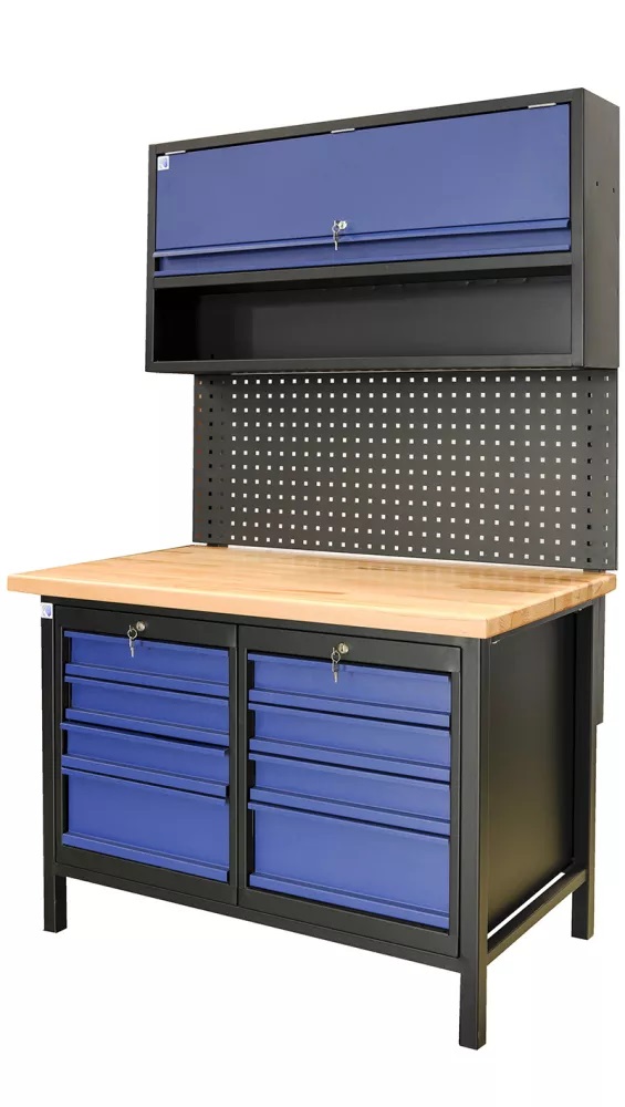 Zostava prac. stôl perfo +skrinka , 2 x zásuvky 1190x680x1920mm šxhxv, čierna/modrá