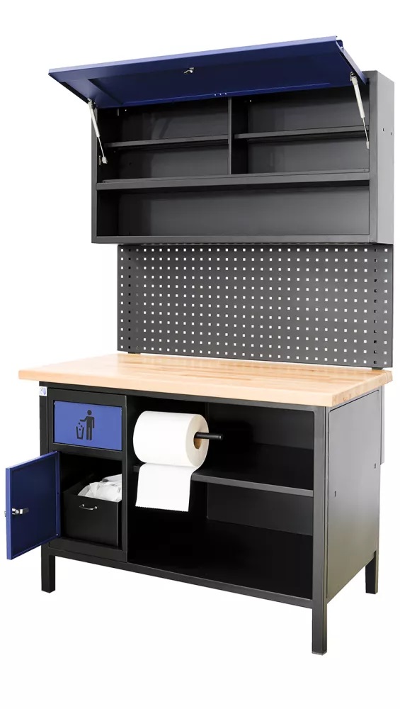 - Zostava prac. stôl perfo záv. skrinka , odp. kôš, 1190x680x1920mm šxhxv, čierna/modrá